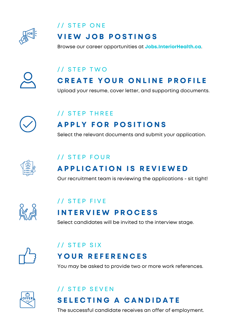 Follow the steps listed below when you’re applying for clinical, corporate and support careers at Interior Health.