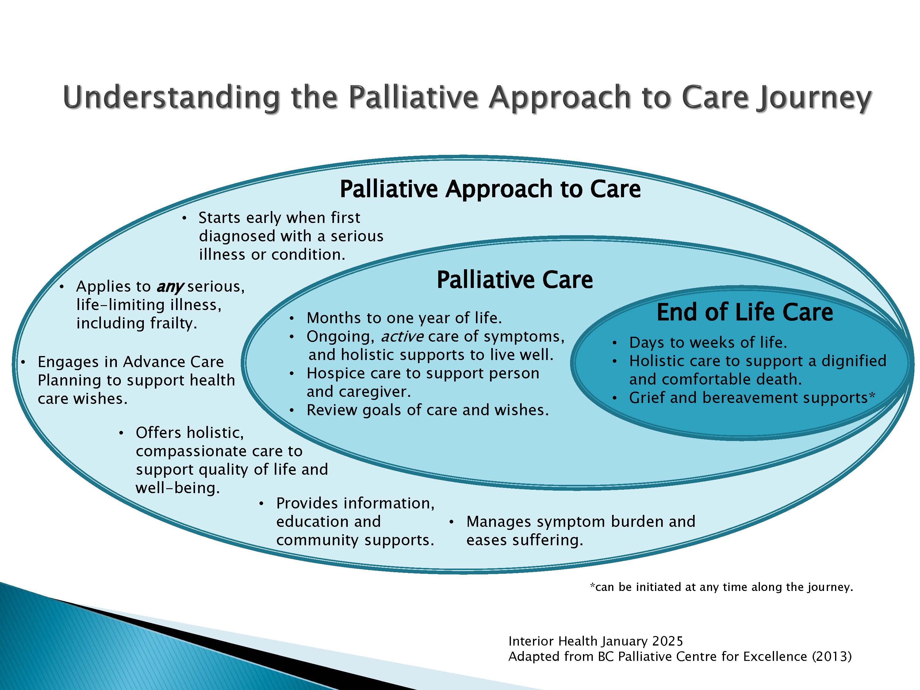 Palliative care is an approach to care that supports the clinical, emotional and spiritual needs of individuals and their families coping with a life-limiting illness. Palliative care and a palliative approach to care focuses on comfort and support to the person and family, assists with making plans and decisions for the journey ahead, and optimizes quality of life. Sharing health care wishes and goals with loved ones, doctors and other health care providers is important.