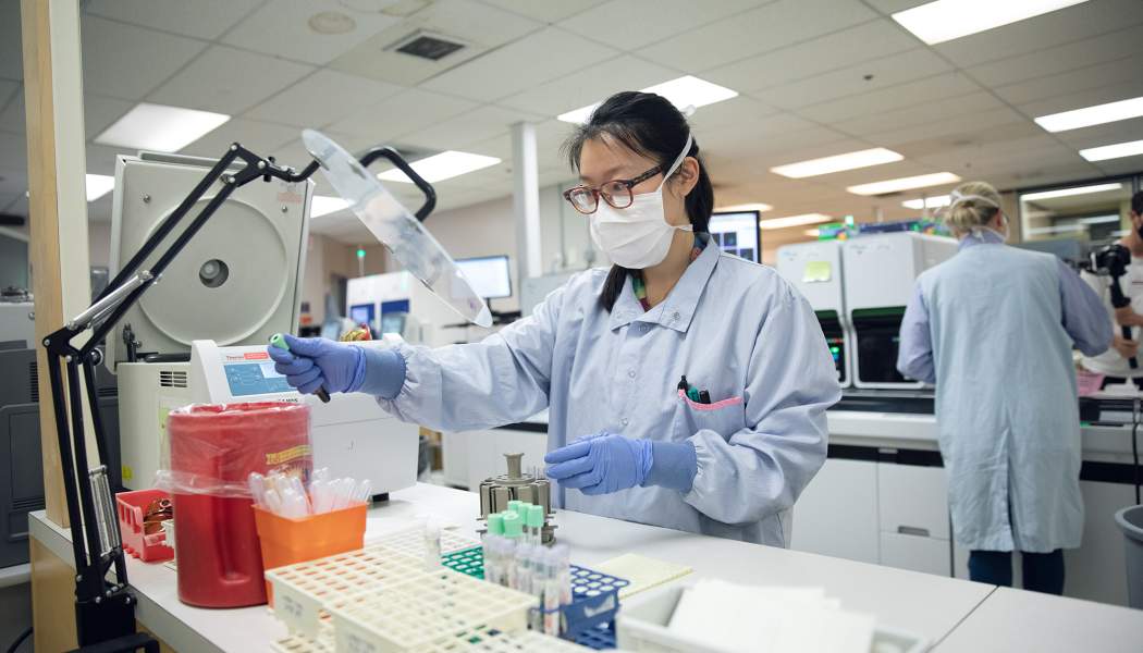 The lab buzzes with activity and the whir of instruments. Lab professionals in blue gowns and gloves move about, placing samples in centrifuges and high-tech analyzers. Technologists sit at microscope stations evaluating blood cells and assessing culture plates for disease-causing pathogens. Others screen patients for compatible blood products. In an adjacent room, technologists inspect and prepare tissue slides for pathologists.